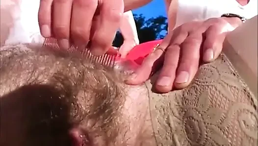 엉덩이에 손을 대고 있는 금발 밀프를 사랑하는 늙은 남자